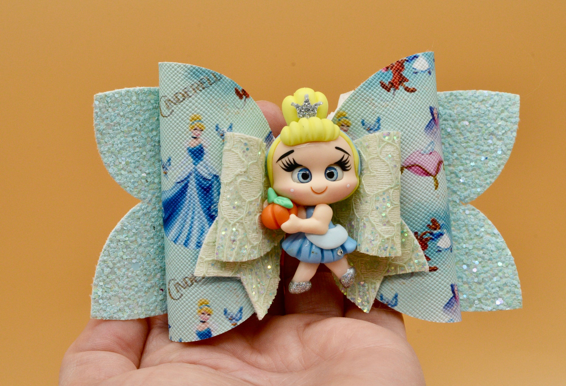 This adorable girls character bow is handmade using vegan fabric. The clay character is handmade of polymer clay. The bow measures 5 inches in length and 3 inches wide. The polymer clay character, Cinderella, measures 2 inches. The bow is fastened to a 2 1/4 inch alligator pinch clip.